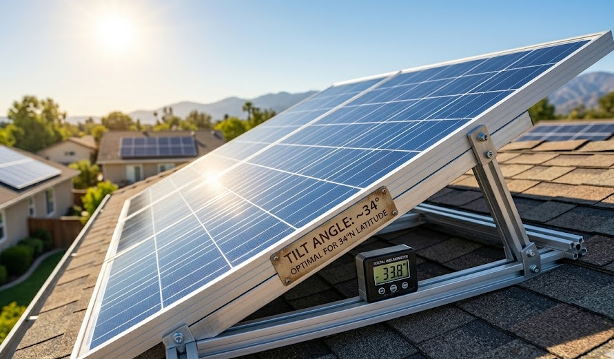 المبدأ الأساسي الذي يحكم الزاوية المثلى للألواح الشمسية هو أن وجه اللوحة يجب أن يكون متعامدًا مع متوسط ناقل الإشعاع الشمسي للموقع والموسم محل الاهتمام. وبما أن المسار الظاهري للشمس في السماء يتغير مع الفصول (أعلى في الصيف، وأقل في الشتاء)، فإن الزاوية التي تعترض فيها اللوحة الثابتة المائلة هذا الإشعاع بشكل أفضل تتغير أيضًا موسميًا. بالنسبة لهدف إنتاج الطاقة المتوازن على مدار العام، فإن زاوية الميل المثالية للوحة ثابتة في نصف الكرة الشمالي تساوي تقريبًا خط العرض الجغرافي للتركيب، ويجب أن تواجه اللوحة الجنوب الحقيقي. بالنسبة للتركيب في نصف الكرة الجنوبي، فإن الزاوية المثالية المكافئة تساوي أيضًا تقريبًا خط العرض الجغرافي، لكن اللوحة تواجه الشمال الحقيقي.